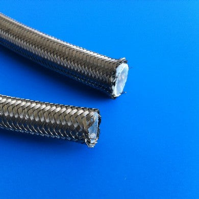 Schlauch aus Fluorkunststoff mit Edelstahlumflechtung, mit Trinkwasserzulassung, geschmack- und geruchlos, nicht toxisch, besonders alterungs- und UV-lichtbeständig, temperaturbeständig, beständig gegen alle flüssigen, gasförmigen und korrosiven Medien, alle Säuren, Alkalien, Lösungsmittel, Öle, KraftstoffeEinsatz für Chemikalien, Farben, Lacke, Klebstoffe, Dampf, Mineralöl, Bioöl, Rapsöl